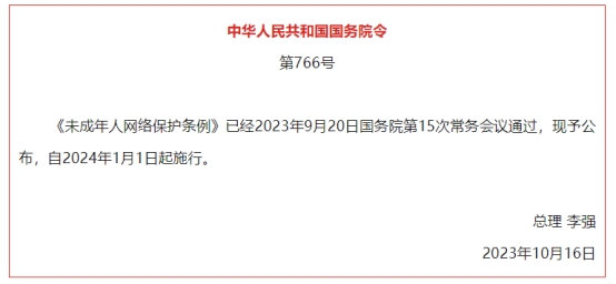2023年10月16日, 国务院公布《未成年人网络保护条例》(以下简称《条例》),《条例》共7章60条,自2024年1月1日起施行。